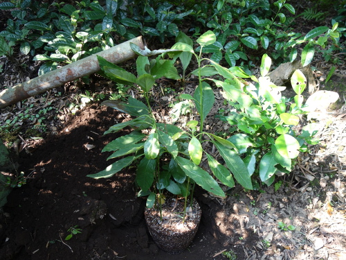 フェイジョアの植えてある鉢に穴を掘って根が折れないように垂直に差し込みました。地中には少し空間が出来ていますが、水を遣れば土で埋められると思います。