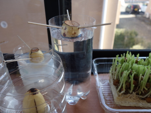 芽が出てきています。頂部を切るとスムーズに芽が出て来ることがわかりました。例えばアボカドNo.14の場合、種の頂部が塞がっていたため、芽が出て来れずに内部で曲がっていました。割れ目をアイスクリームの棒を使って開いて、曲がった芽を爪楊枝で表面に出してやりました。最初から切ってやっていれば、自然に真っ直ぐ出てきたと思われます。