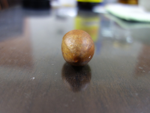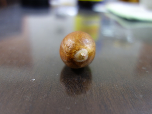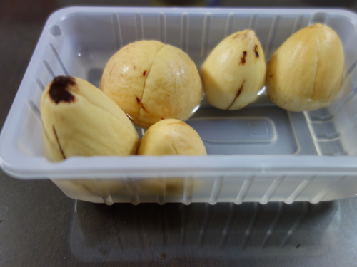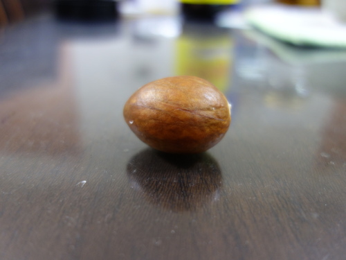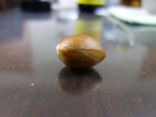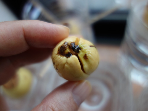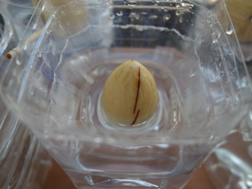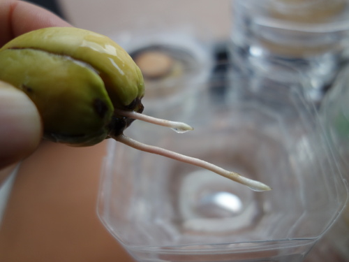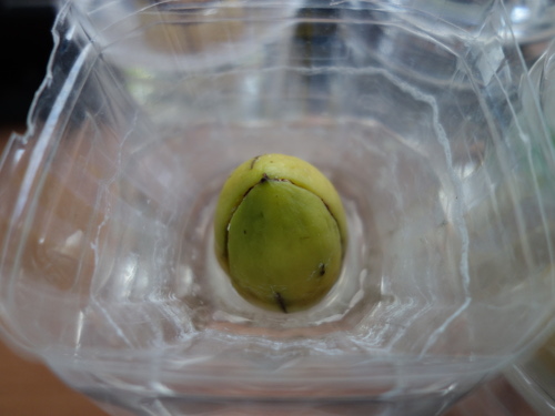 大きい種が入っていると予想した卵形のアボカドNo.5の中にはかなり小さい種が入っていました。果柄は太かったので、種は大きいと予想したのですが、はずれました。その種を水栽培して、発芽したら鉢植えにします。