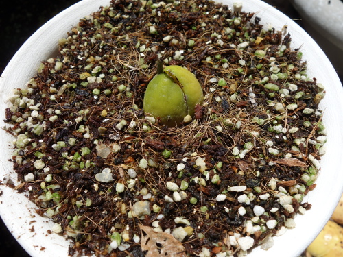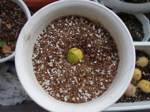 発根してから子葉に相当する種に葉緑素もできてきました。2017年3月2日に鉢植えにしました。これまでいろいろな種を見てきましたが、小さめの種の方が発芽しやすい印象です。