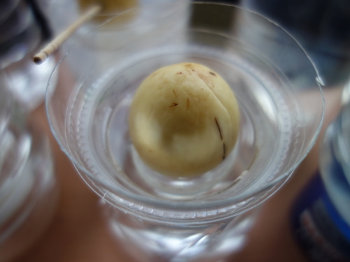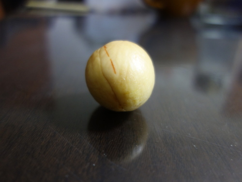 レッドキャベツから買ってきたメキシコ産のアボカドNo.6(税込み105円)の種です。どんぐり型で、割れ目が中央を通っていません(左右対称になっていません)。このようなタイプの種は一般に発芽しにくいので、頂部を8mm切り落としました。底部はそのままです。この状態で水栽培して発芽挙動を検討します。