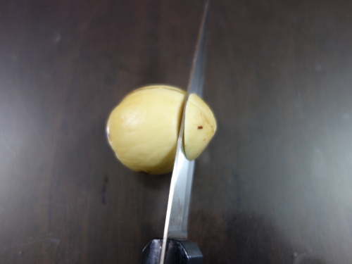 非対称の割れ方をしている種なので、頂部を切り落とすことにしました。