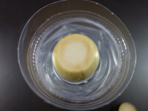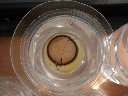 PETボトルの水に浸けました。断面を見ると種の割れ方に偏りがあることがわかります。