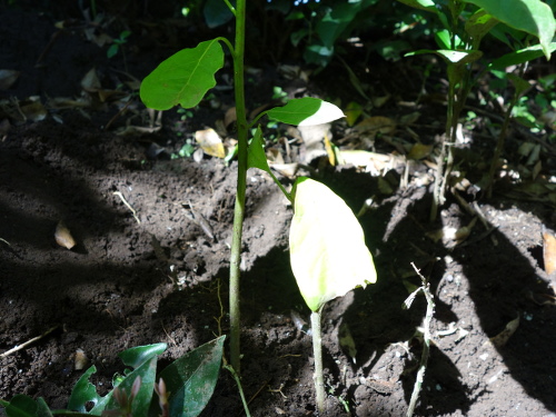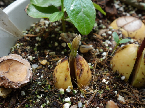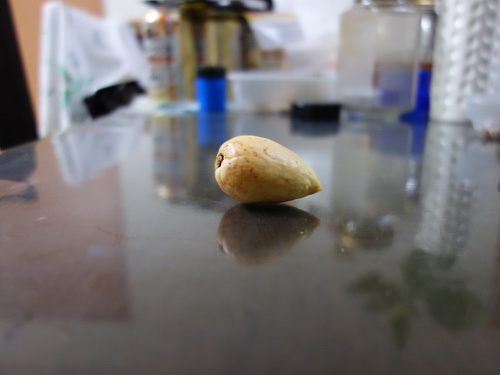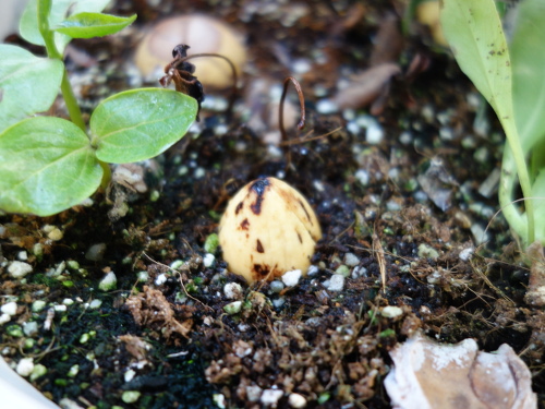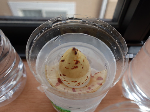 2017年3月19日現在、根が1センチメートルほど伸びていたので鉢植えに切り替えました。これまでいろいろな種の大きさ・形と発芽しやすさの検討をしてきましたが、今回、縦長のタイプでは大きな部類の種でも発根しました。底面を切り落とした方が発根しやすいような気がしますが、そのまま用いても出るものは出ます。確実性を求めるなら切った方がいいような気がしています。切ったからといって腐りやすいこともありません。また、大きい種より小さめの種の方が成功率は高いような印象を私は持っています。