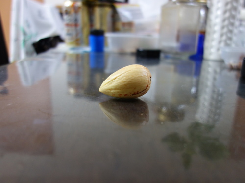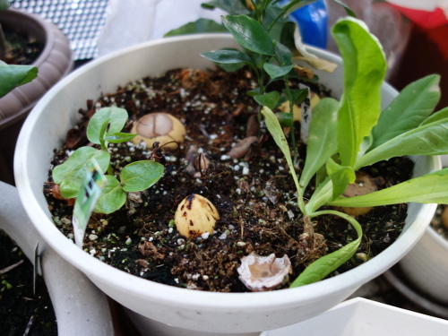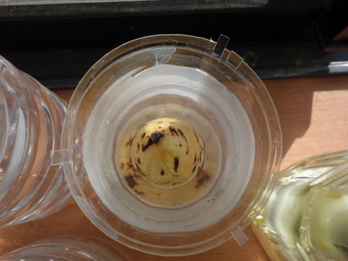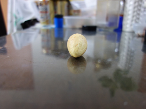また、真球に近い形よりどんぐりの実のように縦長のタイプ(アスペクト比が大きいタイプ)の方が発芽しやすいような気がしています。頂部は切り落とした方が芽が出て来る際の障害は少ないです。切り落とさない場合でも、割れ目に沿ってカッターで切れ目を入れてやれば、開くことができるので、発芽における立体障害は少なくなります。