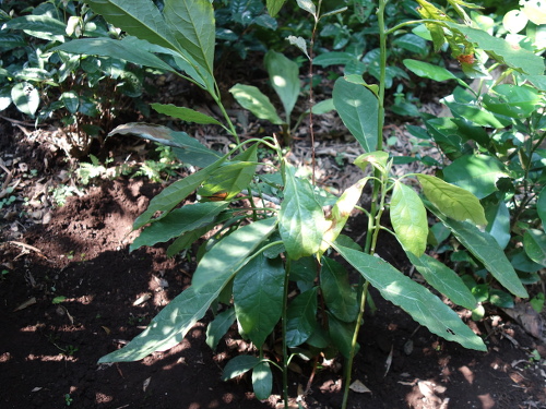 寄せ植えのまま根鉢を地植えしました。アボカドBの後方はアボカドNo.10、その左の低い苗がNo.7です。その左の背の高い苗はアボカドNo.4の実生苗、その手前はNo.14です。