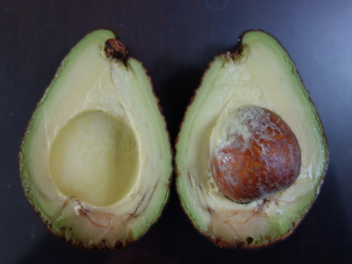 店でアボカド果実を買う時、高い確率で自分の欲しい形の種を選び出すことができます。すなわち、西洋ナシ型の果実はドングリ型の種が入っていて、丸い果実には丸くて大きい種が入っていることが多いです。ただし、種の大きさの判断は形の判断よりかなり難しいというか、例外的なものが多いですが・・・。