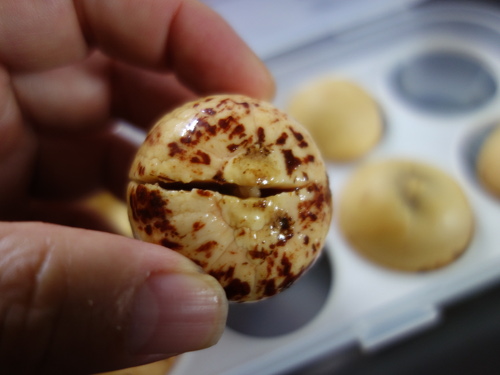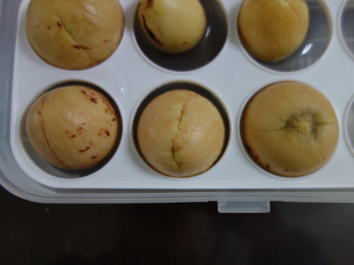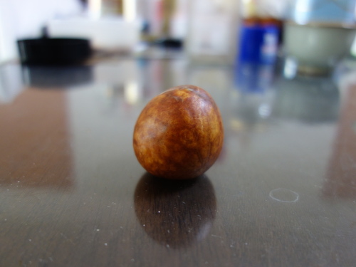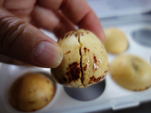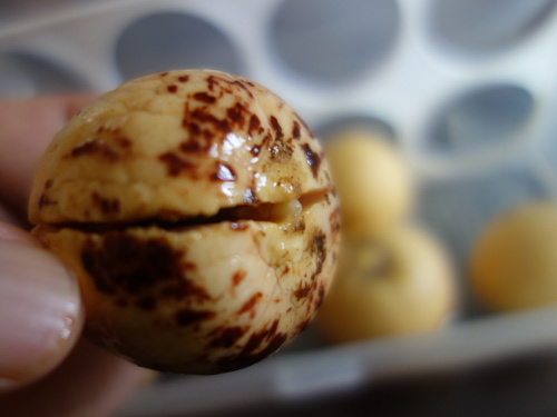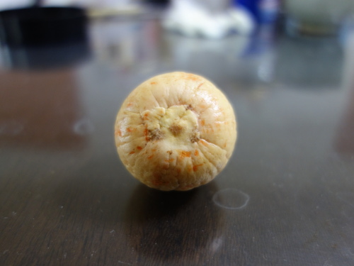 2016年12月9日に買ってきたニュージーランド産の3個のアボカドA, B, Cのうち、Bの種が追熟できたので、12月12日に割ってみました。Aと同じタイプのどんぐり型に近い形の種でした(もっと細くて長いタイプをどんぐり型としていますので、それに近い形、つまり丸形に近いどんぐり型というのがここでの位置づけです)。そして、種の形や色の観察を行いました。いろいろな種がありますが、この種のように表面にけっこうシワが寄っているのはあまりなかったように記憶しています。12月12日から卵ケースの中で水栽培を始めました。