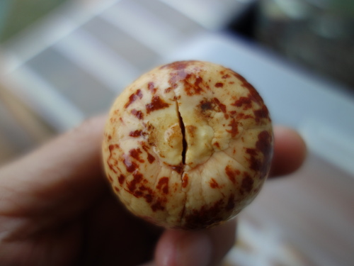 種の色は割と明るめの茶色です。アボカドによってはもっと暗い茶色の種もあります。この角度で見ると左右非対称になっています。この形の種を持つアボカドはけっこうあります。