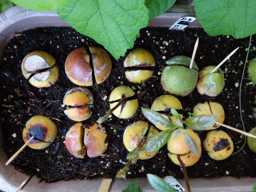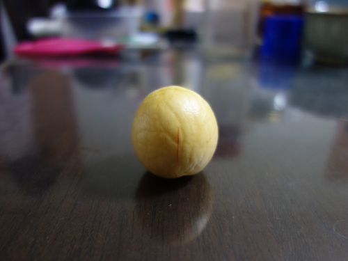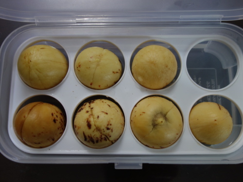 このメキシコ産のアボカドDは果実の大きさに対する種の大きさの割合はD, E, Fの3個のうちで最も小さいものでした。つまり、計算上は果実の密度が最も大きくなるはずです。しかし、実際はアボカドDの方が果実自体が大きいため、種の大きさはアボカドEの種よりも大きくなってしまったばかりでなく、アボカドFの種よりも大きくなってしまいました。よって、種の大きさ自体はこのシリーズでは1番になります(D>F>E)。これまでの経験では丸くて大きなタイプの種は発芽してもうまく生長しないという印象です。このような大きな種は本当にそのような挙動を示すのかを確認するのがこのページの目的です。今、冬なので室内で窓辺に放置しています。変化は遅いと思いますが、あったら随時報告します。