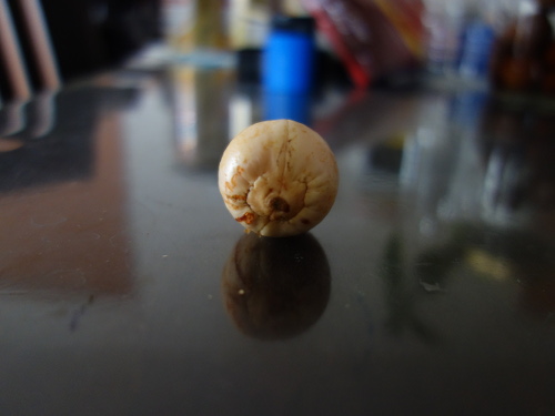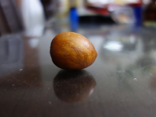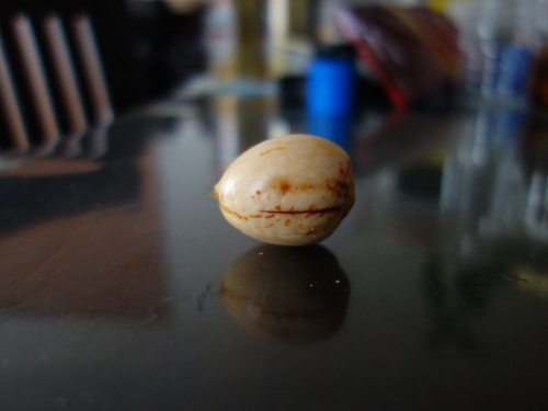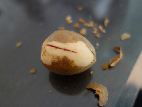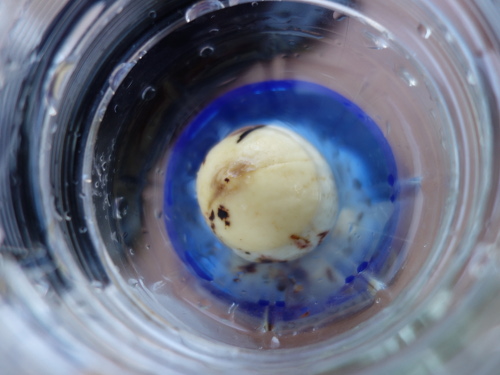 これまでいろいろな形の種の発芽挙動を検討してきた中で、大きくて丸い種より、小さめで尖った形の種の方が発芽しやすいように感じています。そこで、今回、頂部の少し変色した種で水栽培を行っています。水栽培を始めてから39日後の2017年2月28日現在、底部の亀裂が広がってきました。この種は根が出て来ると思います。私が検討しているやり方では、やはり、小さめの種の方が発芽しやすいような感じです。