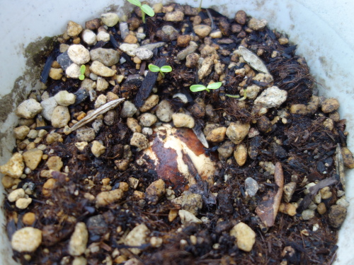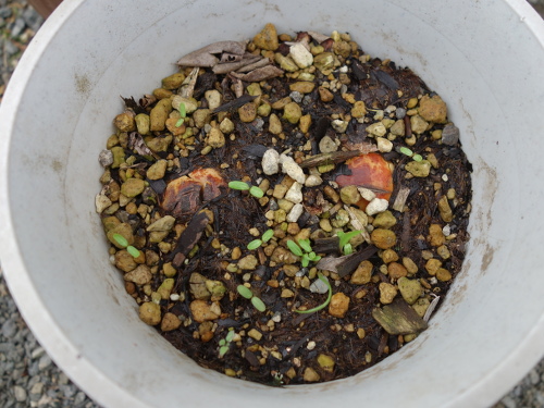 実家の庭で鉢の中に播種していたら発芽しました。これをNo.1としてアボカドの実生を栽培します。越冬がうまくいくならば花が咲き実が生るまで何年かかるか検討してみる予定です。最終的には熱帯果実の最短収穫につながってくれれば理想的です。