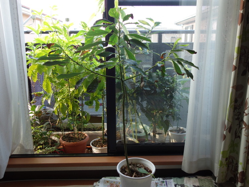 アパートのベランダにNo.1は運んできました。これですべてのアボカドの実生は一括管理できます。