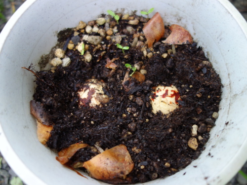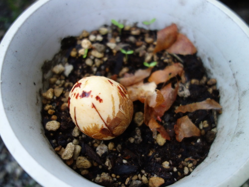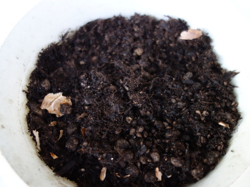 皮を剝いて野菜と花の培養土に埋めました。平たい方を下にします。