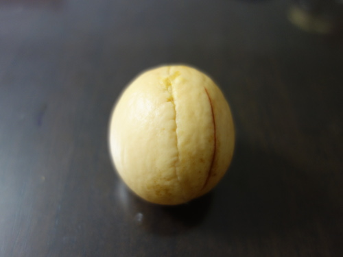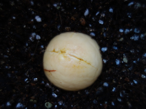 中央の1本の線が種の割れ目です。ここの両端が広がってくれば発芽の兆しです。左下の線は包丁による傷です。