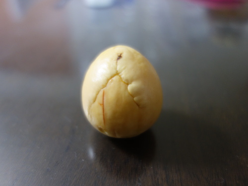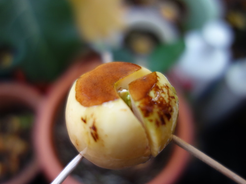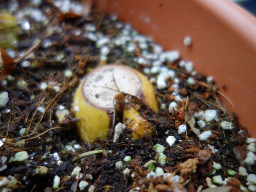 この種はちょっと変わった割れ方をしているので発芽に向けて生長するのか不安でしたが、底部は割れて生長しています。しかし、頂部の方は芽が出るには不適切な構造になっているため、12月25日に包丁でひっかかりを切り取って開くのに支障がないようにしました。これで無事に発芽してくれっればいいのですが・・・。