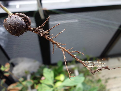 水が少し褐色に着色しています。酸化されて生成した色素が溶け出したようです。底部を切らなかったらこうはなりません。土に埋めた種は切っていないのに発根しています。水栽培でも切らない方がよいのかもしれません。No.16, No.17はもっと着色が顕著です。