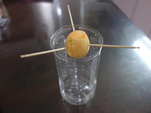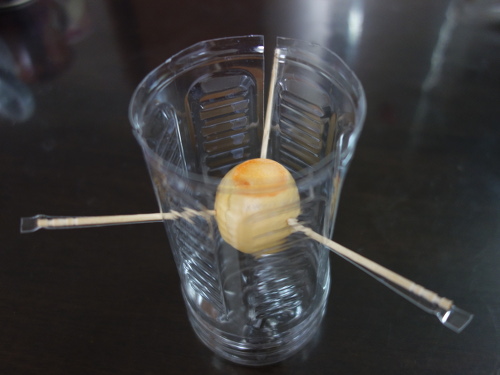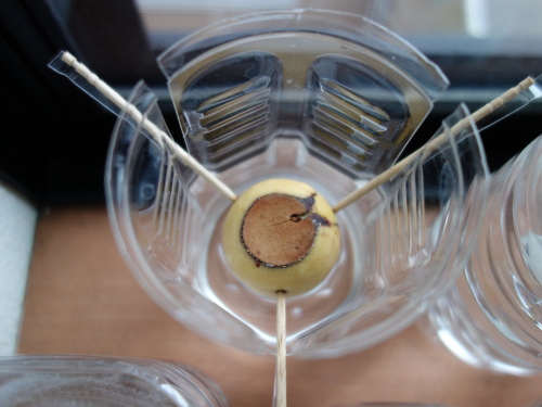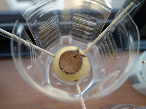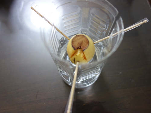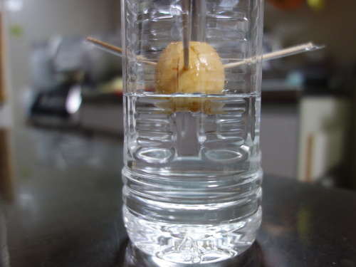 爪楊枝を刺して上下を切り取ったアボカドの種(No.15)の水耕栽培