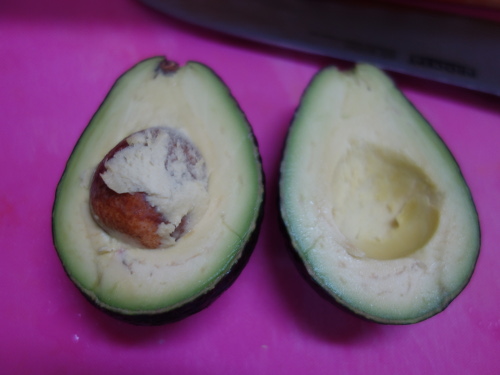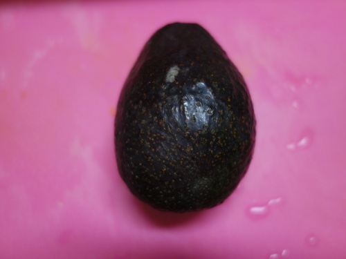 熟して色が黒っぽくなってきました。ただし、背景のまな板がピンク色なので、アボカドの黒が際立ってしまいました。実物はもっと薄いです。