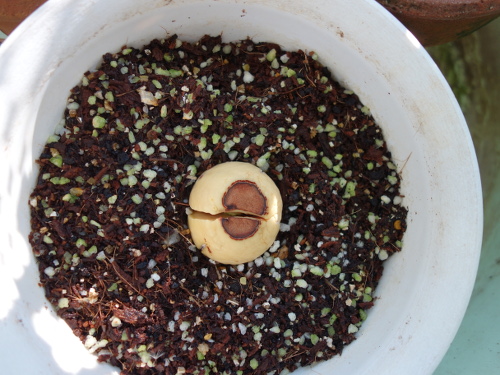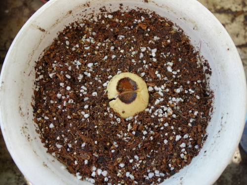 割れ目の中が見えます。下の方に根が伸びています。上の方に芽が出て来るはずです。