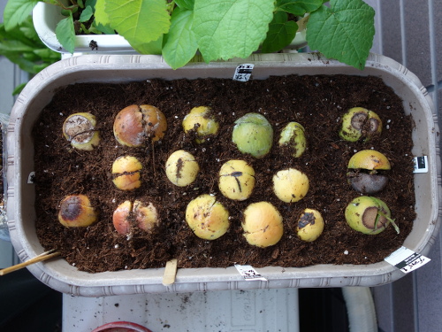 種の褐色の色素が水に溶け出して着色していました。種の底部を切ったせいです。土に植えている種は底部を切らなくても発根しているので、切る必要はないのではないかと個人的には感じていますが、どうなのでしょう。No.17も着色が顕著ですが、No.15はそうでもありません。
