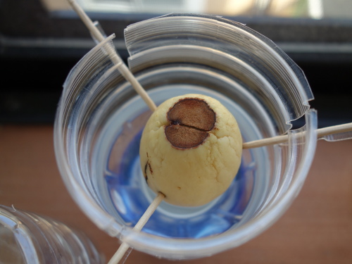 爪楊枝を刺して上下を切り取ったアボカドの種(No.16)の水耕栽培