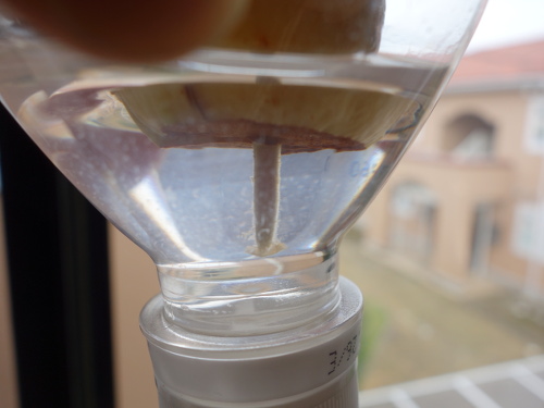 | キッチンばさみで500ミリリットルのPETボトルの上部3分の1あたりを切り取って、それを使いました。No.13で使ったPETボトルは下部でしたが、上部が残っているので有効利用します。120°の間隔で爪楊枝をはめ込む切り込みを入れて、そこにアボカドの種に刺した3本の爪楊枝をはめ込んで使用。しかし、PETボトルの先端で立てると不安定なので、爪楊枝の入っていた容器の上部をくり抜いて、そこにPETボトルの容器を逆さに入れて支えました。 | |