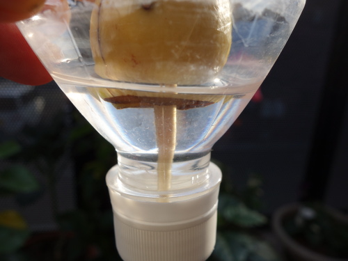 2016年11月28日、根が伸び始めました。底面を2mmほど切り落としているので、その長さを差し引いてもけっこう伸びてきました。頂部と底部を切り落とすのは出てきやすくするためだと思われます。また、水栽培は土の中で起こっていることが目で確認できるので面白いですね。ただし、ある程度生長したら土に植えないと限界があります。初期の観察にはもってこいです。夏休みの自由研究課題には良さそうです。