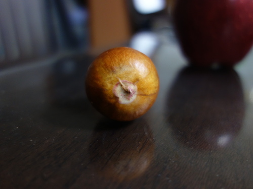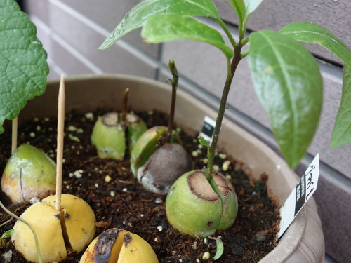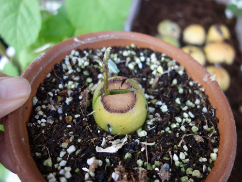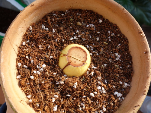 底部の断面はけっこう茶色になっています。ここから溶け出して水が着色しました。この色素は水溶性だということがわかります。そのうち腐るかもしれません。もし、そうなった場合は、種は底部は切らずに土に3分の2ほど埋めるのがベストのように思います。頂部は切ってもいいような気がします。なぜならば、うまくひび割れないと、芽が横から出て来るからです。この現象はNo.4とNo.5で確認しました。