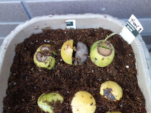 3ヶ月前より種が持ち上がっているような気がします。土が下がったのではなくて根が張って種が持ち上がってきたものと考えられます。芽はなぜか傾いて横から出てきました。