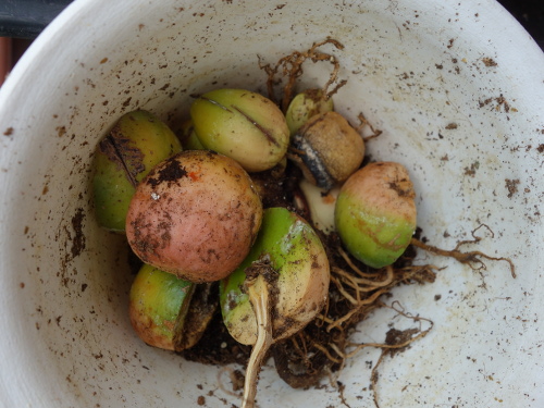 種の底部を切ったせいで、種の褐色の色素が水に溶け出していました。底部を切らなくても土の中では発根しているので、切る必要はないのではないかと個人的には感じています。No.16も着色が顕著ですが、No.15はそうでもありません。
