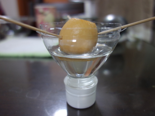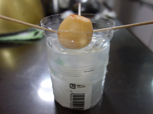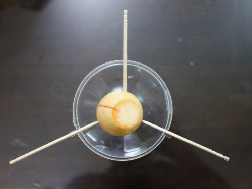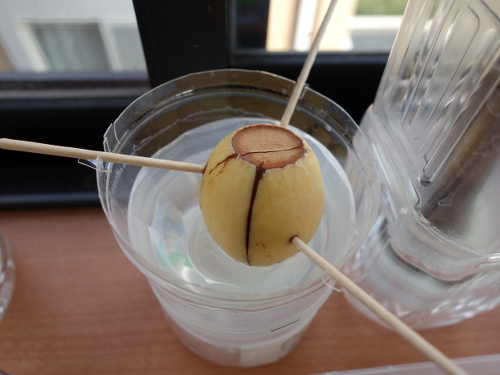 爪楊枝を刺して上下を切り取ったアボカドの種(No.17)の水耕栽培