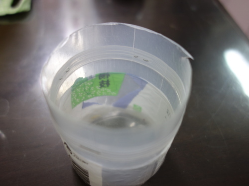 種の底部が少し浸かる程度の水道水を入れました。しかし、PETボトルの上部の蓋は面積が小さいので不安定です。これでは倒れてしまうでしょう。