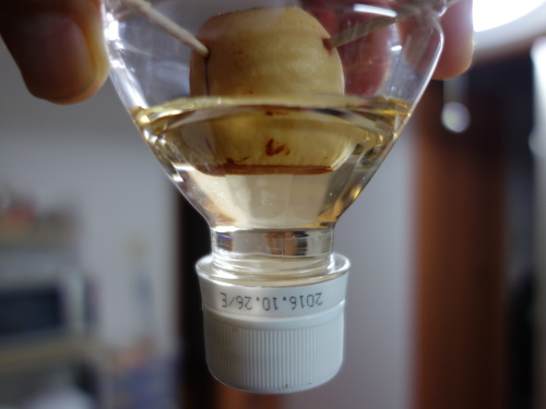 メキシコ産のアボカドを上下を切って爪楊枝を刺して水栽培してみることにしました。果実の形は卵形、これをNo.17とします。No.15, No.16との違いは、PETボトルの上部の深さです。No.17の方が浅い分、水の量が少ないので細菌が繁殖して水が汚れやすかったり、同じ蒸発量でも水面の降下度が大きいなどの問題が種の発根に影響を与えると思ったからです。それと、PETボトルの有効利用です。捨てるのは簡単ですが、もったいないので使うことを考えます。蓋の上部の面積が小さいので全体を支えるのはかなり不安定ですが、ほかの容器を敷いて支えれば問題ないと思います。また、No.17はNo.15, No.16と併せて、種の上下を切って爪楊枝を突き刺して水栽培する方法を検討するのが目的です。つまり、サンプル3つで(n=3で)検討するということです。