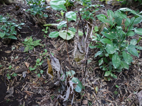 寄せ植えしていたアボカドの苗はすべて枯れてしまいました。生き残っているのはフェイジョアの実生だけです。
