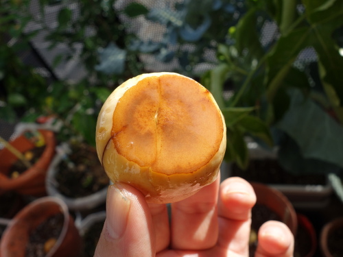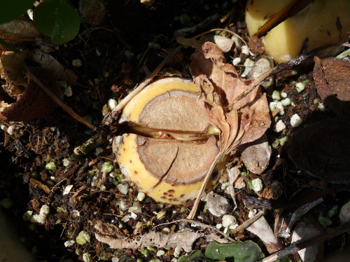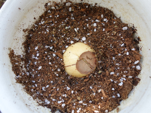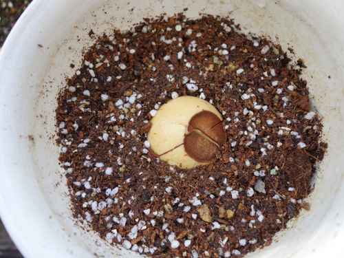 結局、この3ヶ月後の5月30日現在でも全く変化がありません。カッターで端っこのくっついている部分に切り込みを入れました。種は開きましたが、芽が出て来る気配は感じられませんでした。