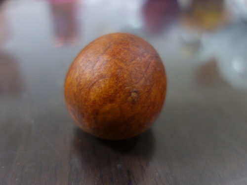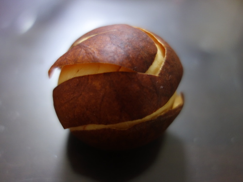 皮は一続きで剝けました。りんご皮むきみたいな感じで一繋がりです。試しにもとに戻してみました。