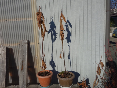2018年1月26日時点ではすでに完全に枯れています(右はアボカドA)。よって、うちの気候では越冬はできないことがわかりました。