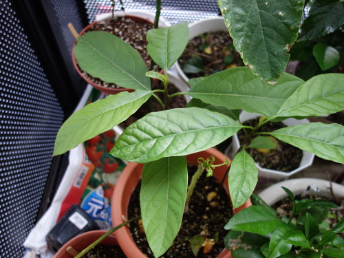 このアボカドの種は大きくて丸い種でしたが、実生苗の葉っぱは大きくて軟らかい葉っぱです。太陽光が当たった時にきれいです。このNo.22の実生苗はNo.8の苗に次いで2番目にお気に入りです。
