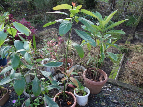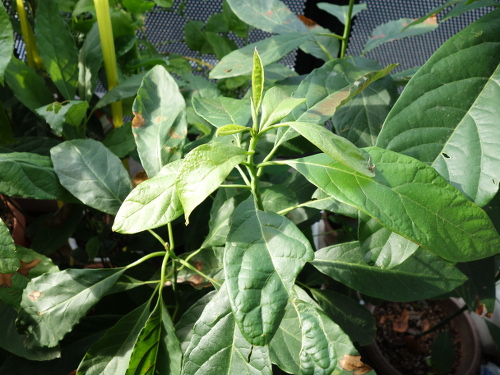 12月3日時点では生長末端は寒さで枯れているものの、それ以外の部分は特に枯れてはいません。右はアボカドA。