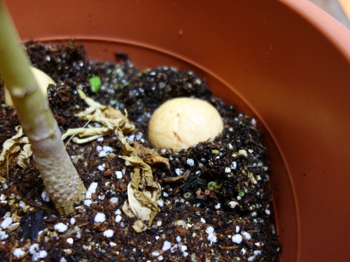 水栽培していた種は、2016年12月13日の夜、パパイヤを植えている鉢に植えました。