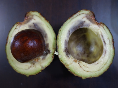 11月18日にスーパーストアだいのぶで買ってきた1個198円+税のニュージーランド産アボカドです。ニュージーランド産は通算4個目。果柄がかなり太い方だと思ったので、種も大きいのではないかと予想しました。しかし、これまで検討してきた20個にあったいくつかの大きい丸い種よりは小さかったです。しかし、No.21と比べた場合、果柄は太い方が種が大きいのではないかという仮説と矛盾はしません。