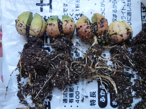 2017年4月28日現在、このままでは埒があかないと思い、No.4, No.5, No.9とともに1つの鉢にまとめました。根が太くなって来ると割れ目が広がってくることがわかります。発芽は厳しいかもしれません。