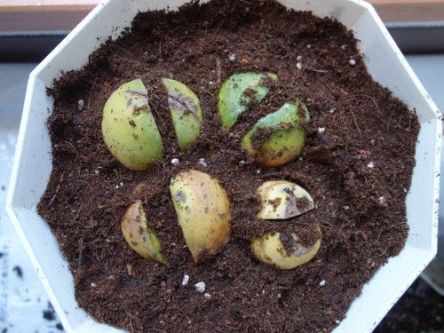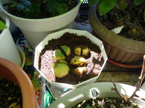 1つの鉢にまとめた冬の寒さで芽が枯れたアボカドの種。左上から反時計回りにNo.4, No.6, No.9, No.5。土はDCMブランドの「花と野菜のかる〜い培養土」。