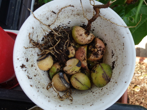 左からNo.4, No.5, No.6, No.9のアボカドの種。芽は冬の寒さで枯れてしまいましたが、根はけっこう張っていました。これらを1つの鉢にまとめました。土は「花と野菜のかる〜い培養土」を使いました。