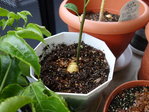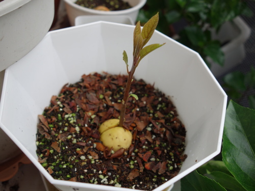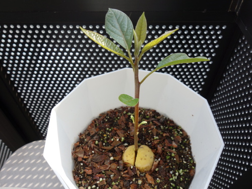 種の底部に紐状のものが付いていたペルー産アボカド(No.8)の実生栽培