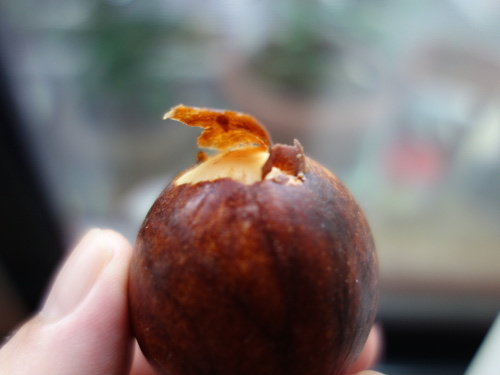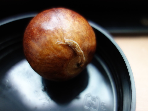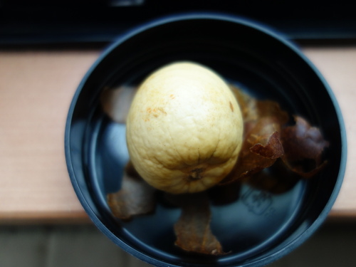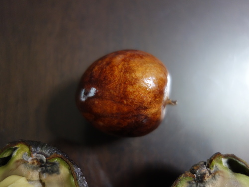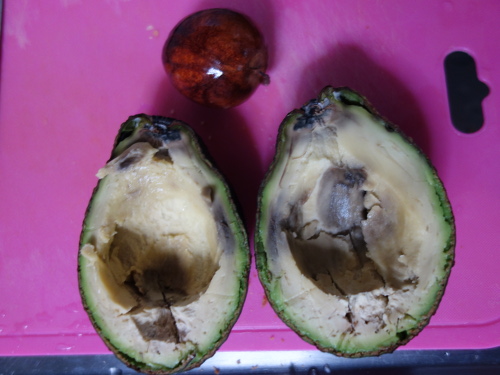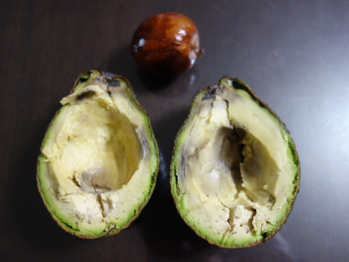 ペルー産のアボカドの実生(No.8)は、割ってみたら色が変色していました。熟成が進みすぎたのか、元々そういう品種なのかはわかりませんが、味は普通でした。ペルー産のNo.7と似たような果実と種ですが、種の底部に紐のようなものが付いていました。皮を剝くと取れました。アパートのベランダで鉢植えしています。