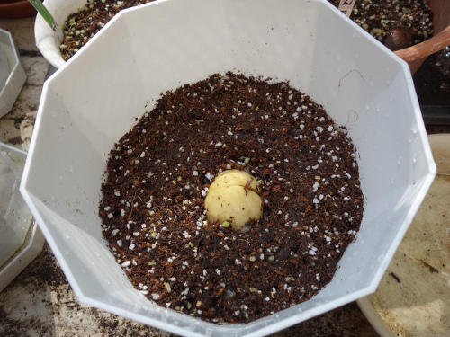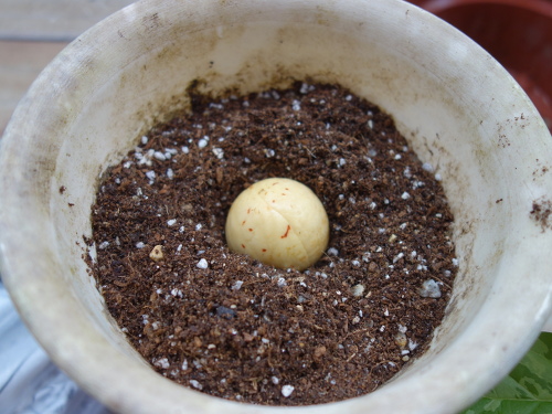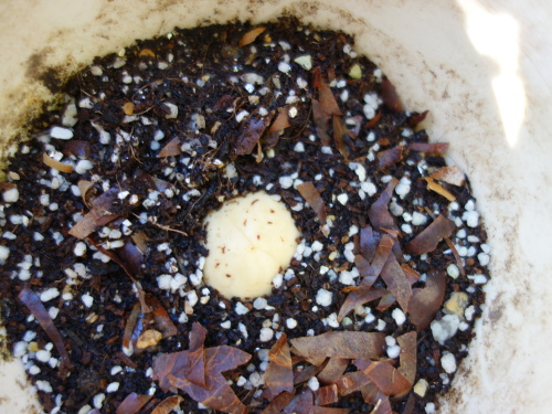 鉢に培養土を入れて、種を立てて3分の2ぐらい埋めました。このあと、種の皮も置きました。
