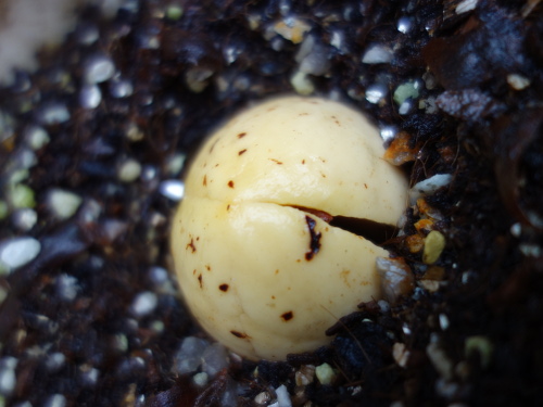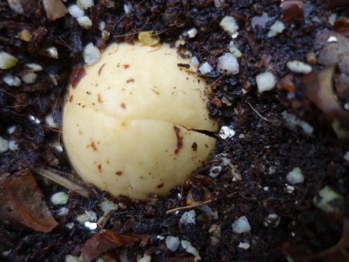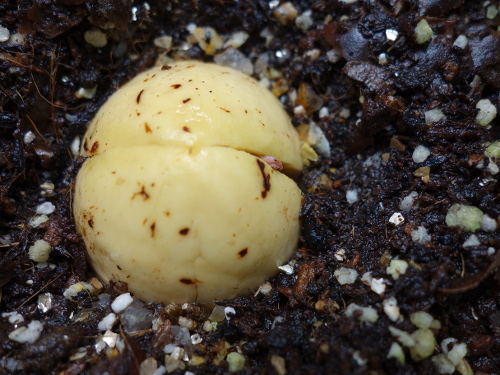 10月13日の夕方現在、割れ目が広がっているのに気付きました。根が生えてきていると考えられます。このままいけば発芽してくれそうです。
