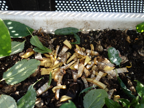 5月20日(水)にバナナの皮をチューリップの球根を刻んだものの上に置きました。
